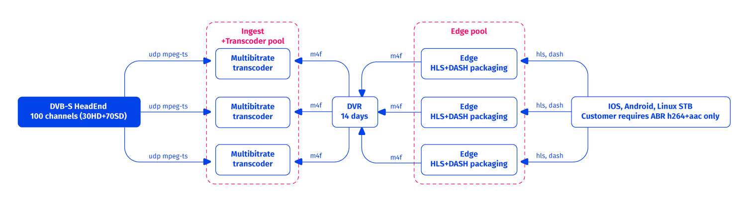 Let's look at the Flussonic video pipeline using the example of an OTT service, where streams received by the head station are used as a source.