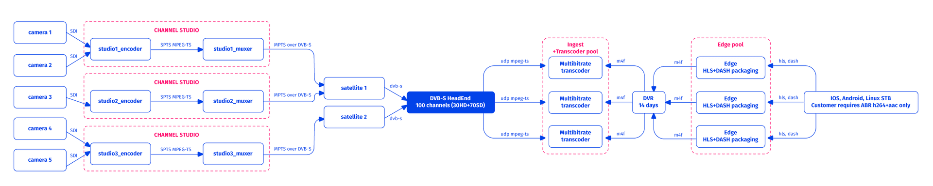 As a result, we built a chain of 13 steps (in the example with an IP camera, we had 7 of them in total). Moreover, this is only a "piece" of the path that the video follows. The frames somehow came to Flussonic via satellite, compressed using a codec, packed into a media container β which means there were still 5-15 steps before Flussonic.